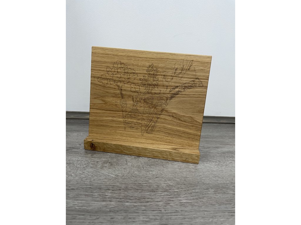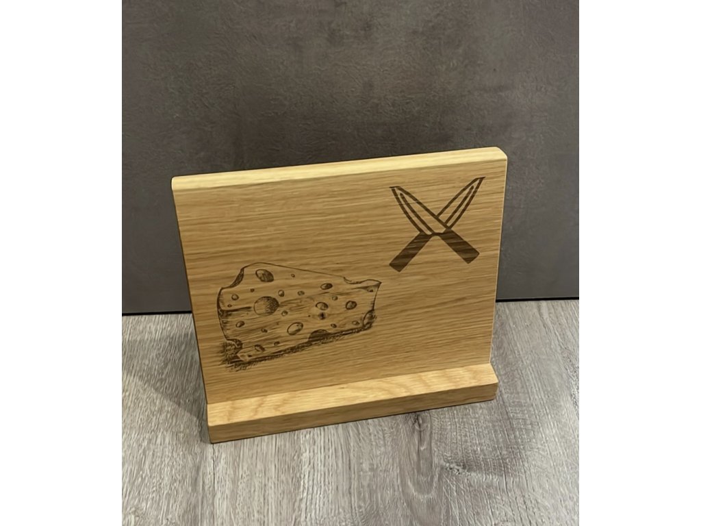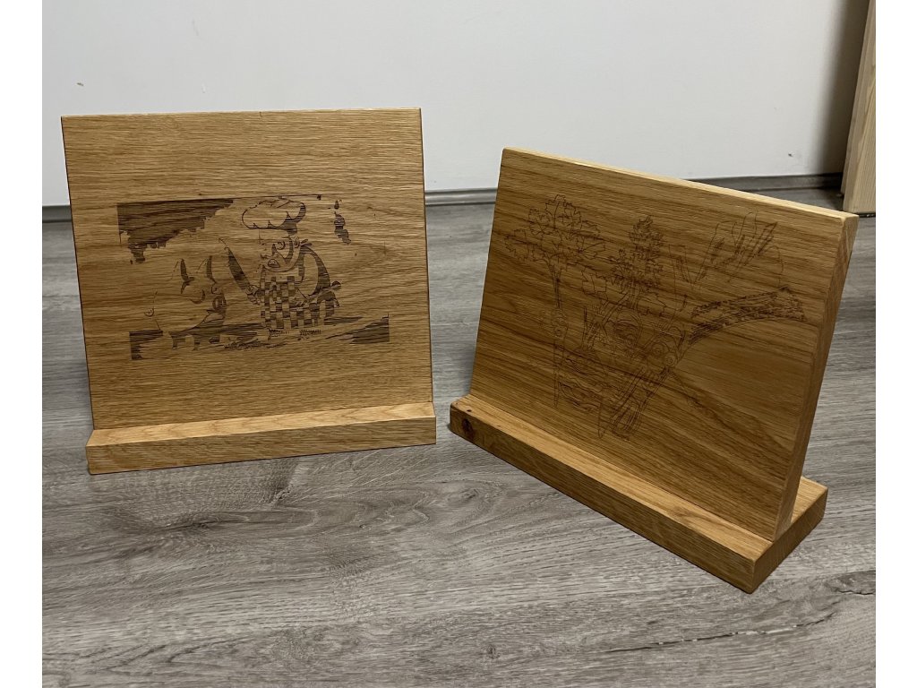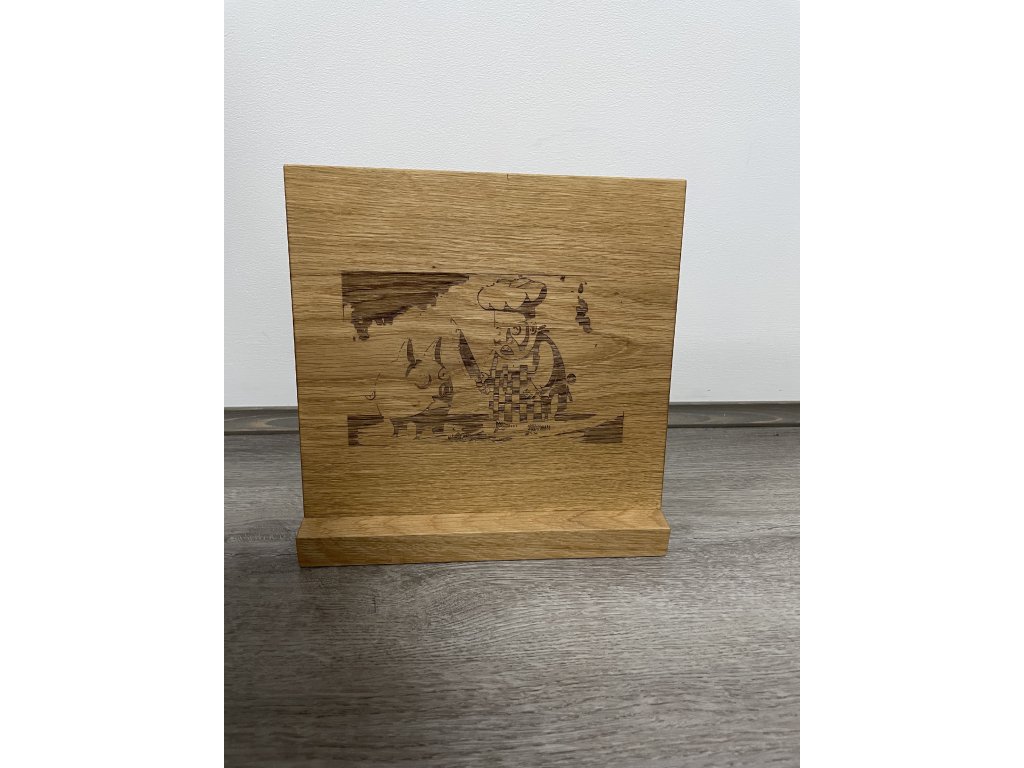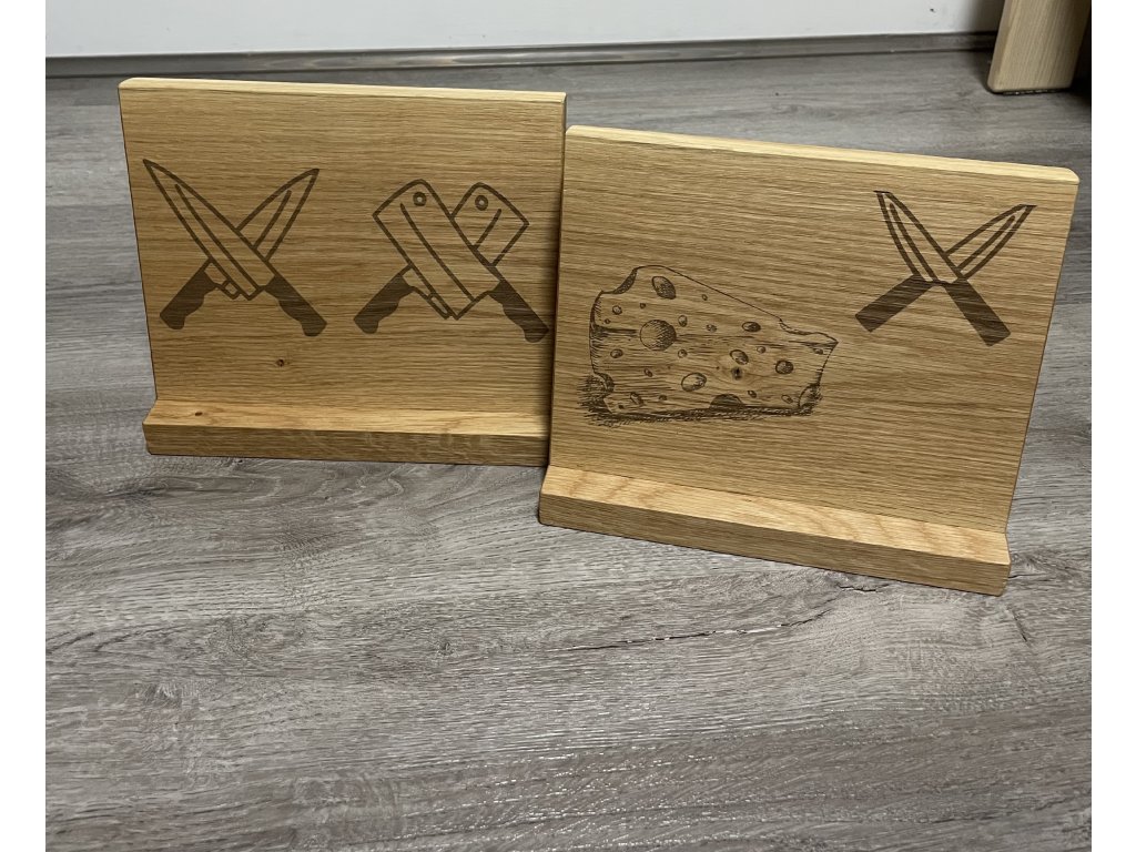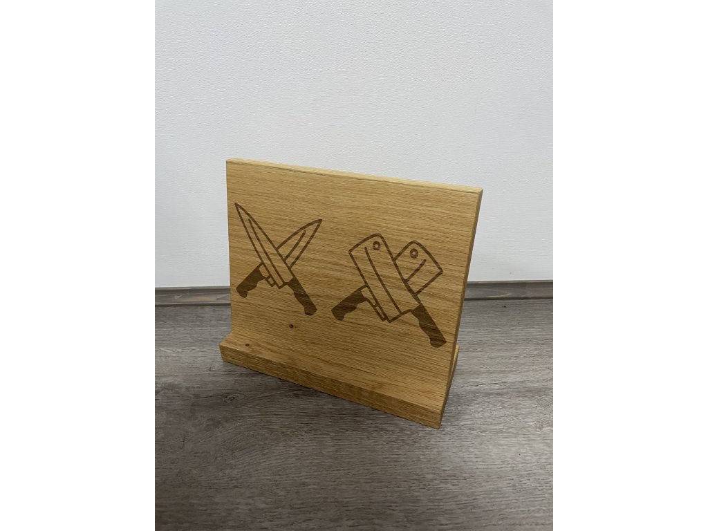 Jednostranný magnetický držák na nože z dubového dřeva s gravírováním. 22 cm vysoký, 24 cm široký.
