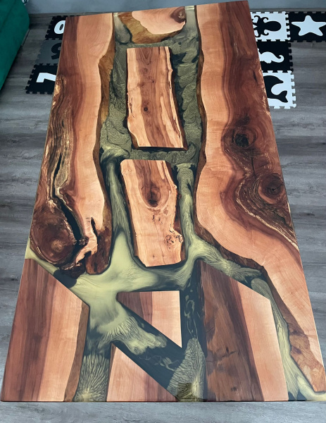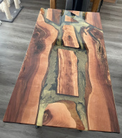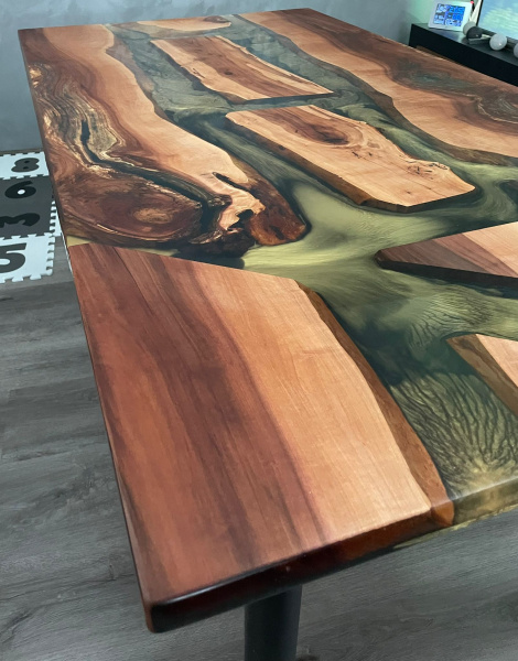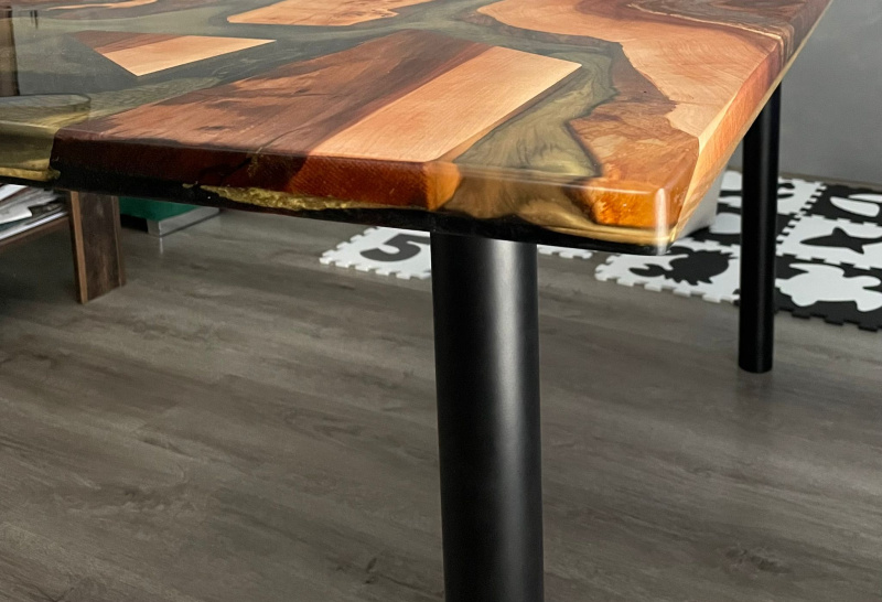 Ahoj, dnes jsme dokončili projekt jídelního stolu pro naši zákaznici. Výber dřeva padl na ovocné kusy. Rozložení dřeva a barev epoxidu si zákaznice takto navrhla sama. Dřevo je stabilizované přyskyřicí. Spodní vrstva je černý pigment přidaný zlatým, tak aby zlatá byla dominantní. Zbytek je čířý epoxid. Celkem bylo spotřebováno 17 litrů epoxidu. Podnoží je stavitelné a v černé matné barvě. Povrch stolu ošetřen špičkovým olejem Rubio Monocoat Pure. Rozměr jídelního stolu je 150*80.