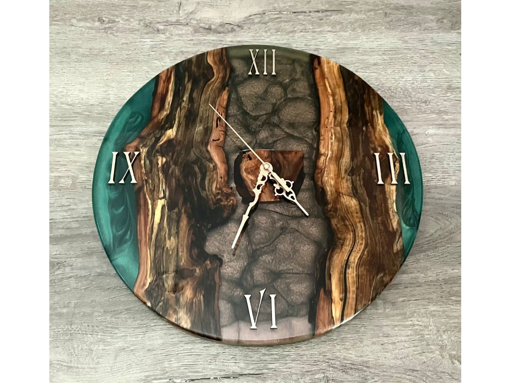 Hodiny s pryskyřicí mají průměr 30 cm, vysoké jsou cca 3 cm. Nejsou vhodné na slunná místa kvůli povrchové úpravě lakem.