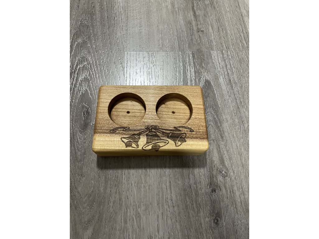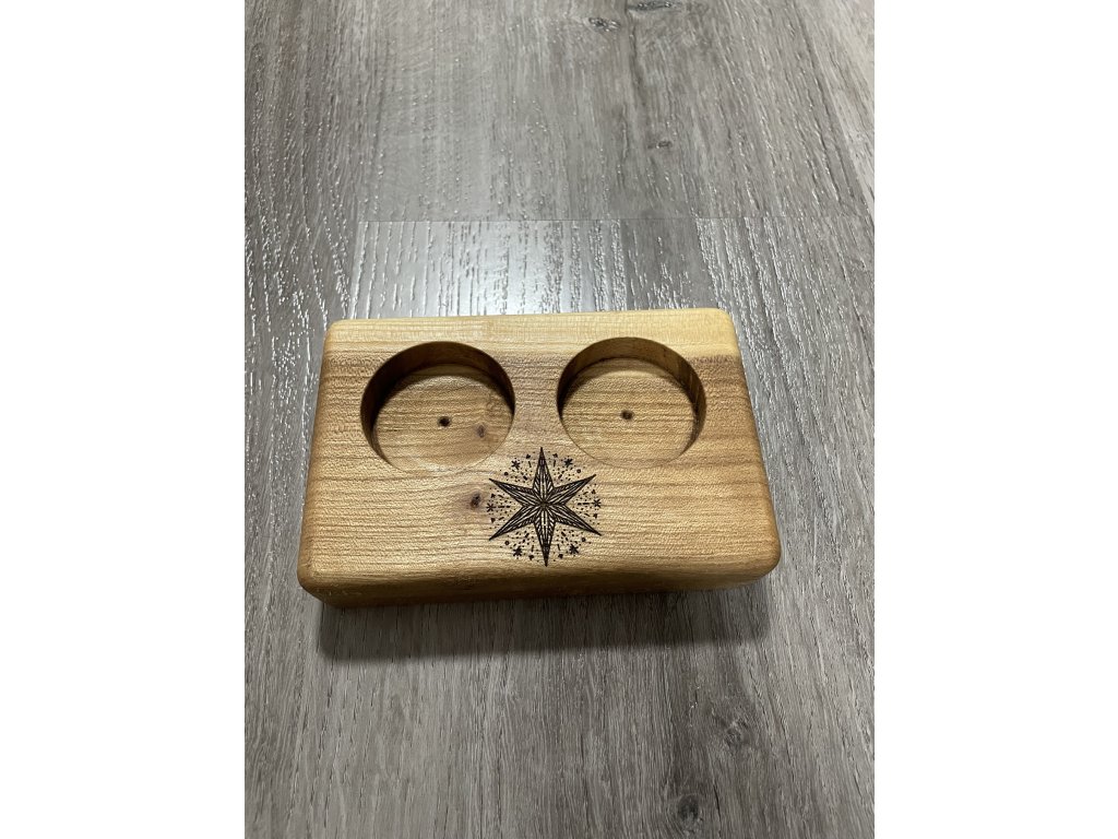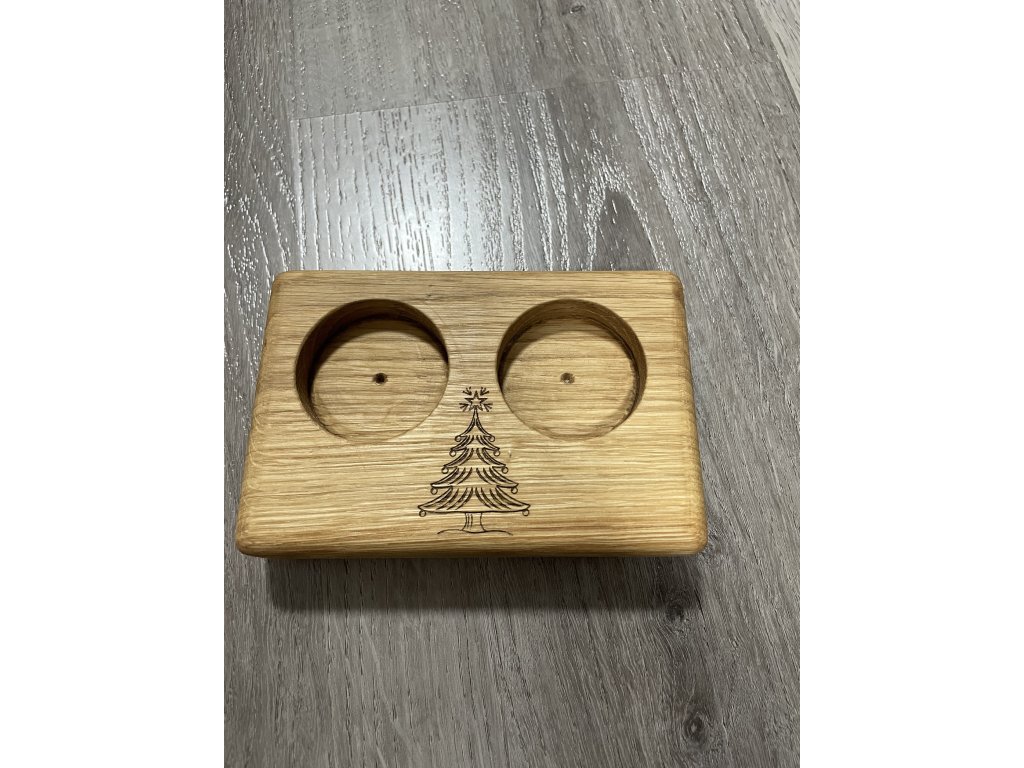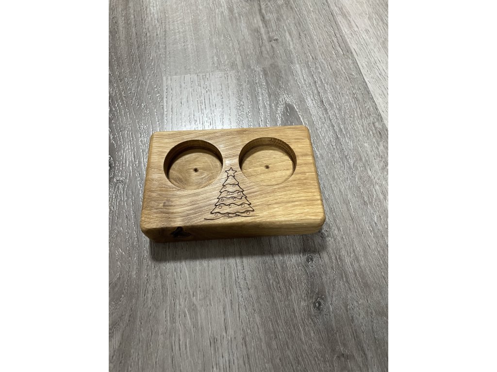 Dřevěný svícen z jilmového, jasanového a akátového dřeva. Rozměry 15 cm x 9,5 cm.
