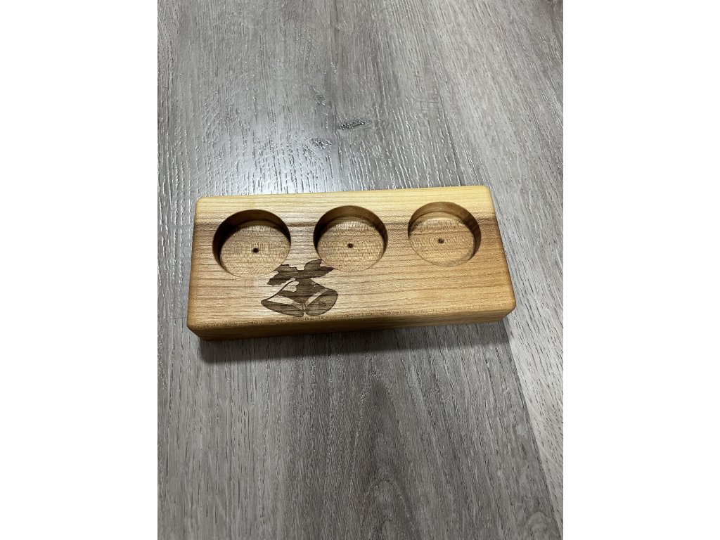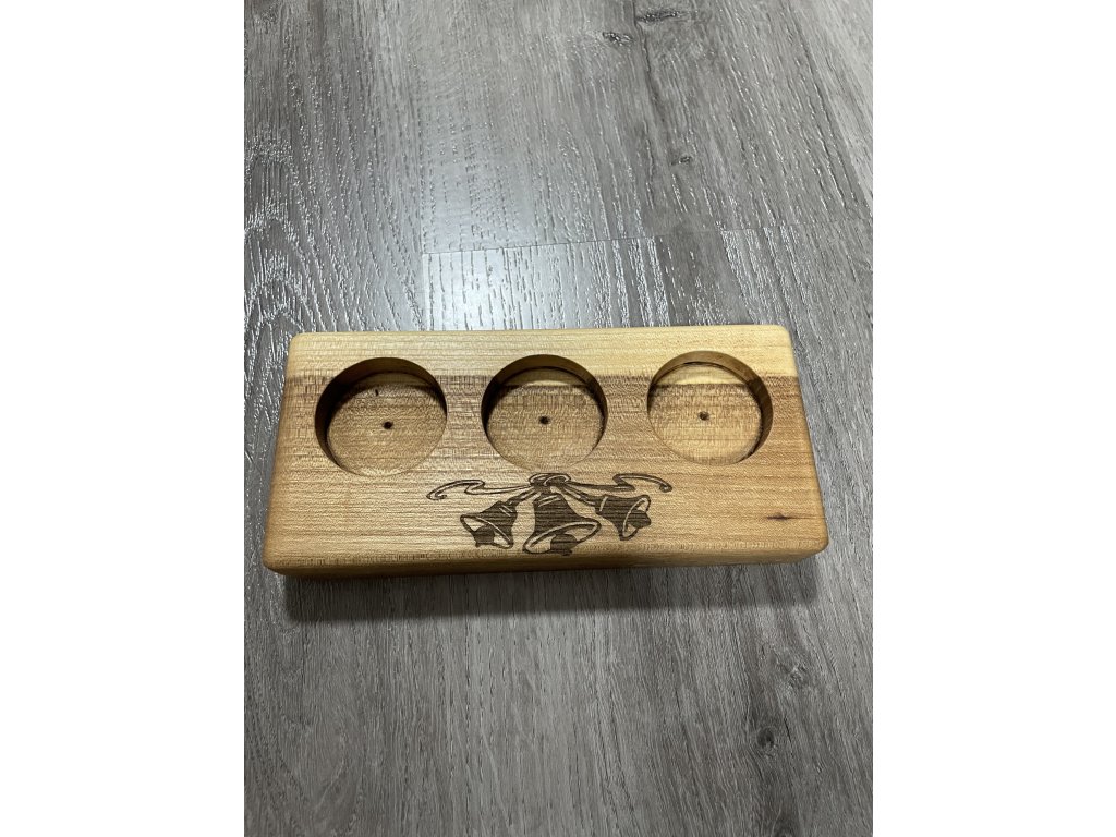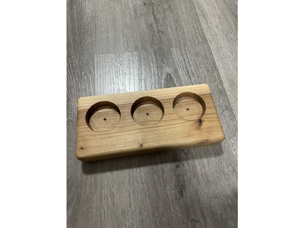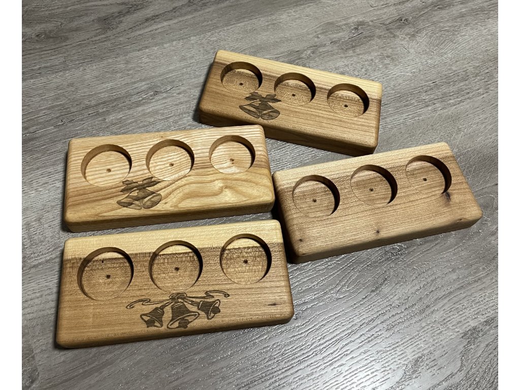 Dřevěný svícen z jilmového, jasanového a akátového dřeva. Rozměry 21 cm x 10 cm.