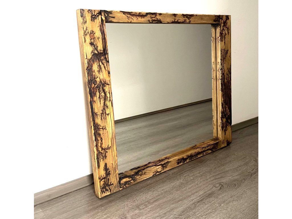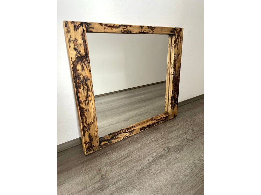 Zrcadlo s dřevěným rámem doplněným o vypalované paprsky. Rozměr samotného zrcadla je 40*40cm. Ošetřeno olejem Rubio Monocoat.